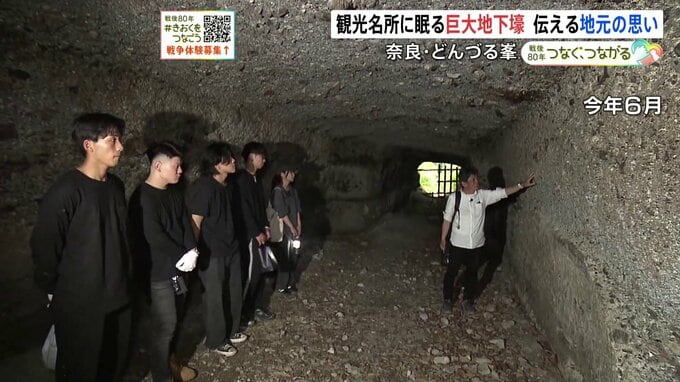 戦後80年プロジェクト「つなぐ、つながる」です。観光名所の地下に眠る、旧陸軍の巨大な地下壕。一体何のために掘られたのか。戦争の記憶を後世に伝える取り組みが地元で続いています。白い岩肌が、「鶴」が「屯」…