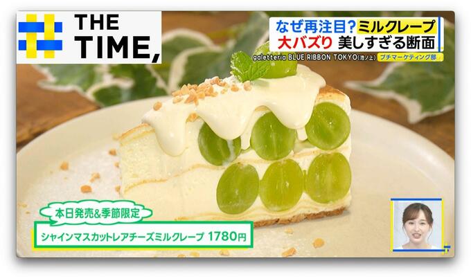 まるで“ショートケーキ”のような「シャインマスカットレアチーズミルクレープ」(1780円※7月16日から販売・季節限定)は、クレープ生地に練乳入りのレアチーズクリームの分厚い層、そこにシャインマスカットがゴロゴロと。それが2段になった贅沢な進化系ミルクレープです。