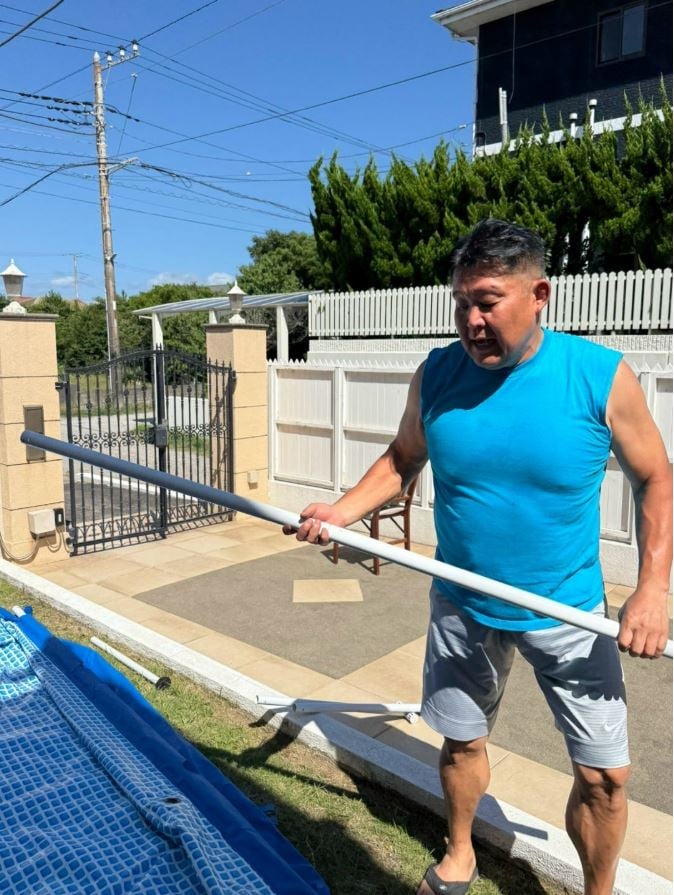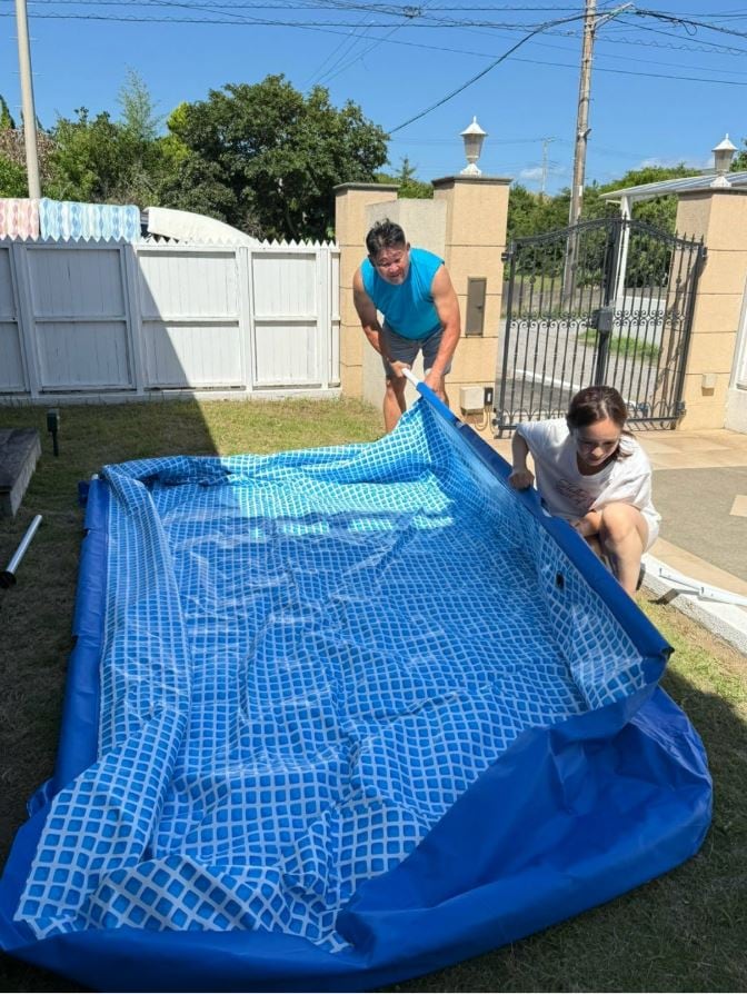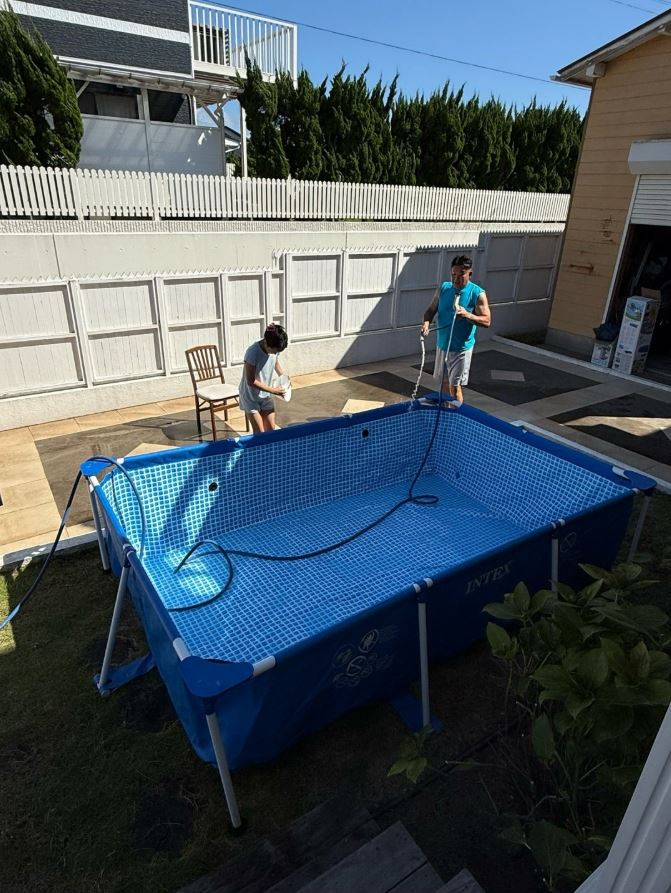 花田さんによると、プールの設置は「今回も妻が指示役、私が実行役で夫婦の共同作業」で行われたとのこと。ブログには、青いビニールプールを庭に設置する様子が写真とともに紹介されています。晴れた青空の下、家族でプールの準備に取り組む姿が印象的です。