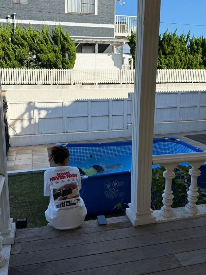 プール設置後の水入れ作業については、「完成したら桃果と水入れ 貯まるのにまあまあ時間がかかります」と説明。しかし、「早く入りたい桃果は水の量半分くらいのところで入ってます」と、子どもならではの待ちきれない様子も、微笑ましく伝えています。