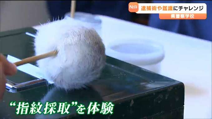続いて行われた鑑識の授業では車上荒らしや空き巣被害を想定し、車や玄関、金庫など犯人が触れた場所を調べます。