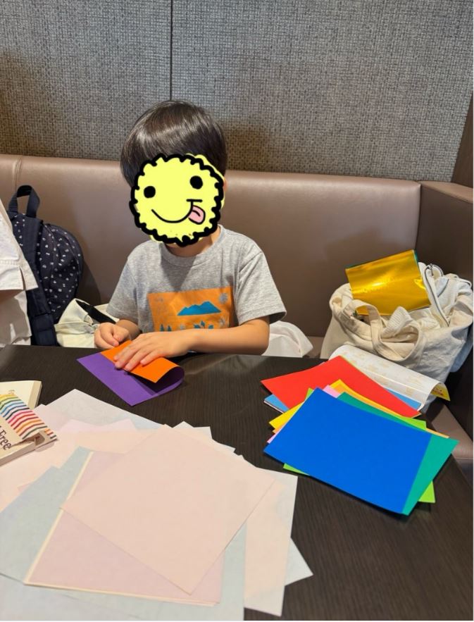 また、旅行の持ち物として、「お出かけの時の必需品!セリアで購入した色鉛筆、画用紙、シール、折り紙」を挙げ、「お出かけの時に持ち歩いていますが、助かります」と話しています。特に折り紙については「手裏剣を作るのにハマっています!」と子どもたちの様子を紹介しました。