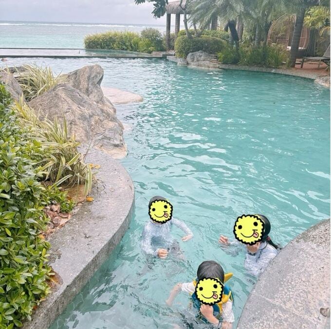グアム到着後、チェックインを済ませてすぐにプールへ向かったことも報告。「次男と三男は、プールをとにかく楽しみにしていました!」と子どもたちの様子を伝えています。
