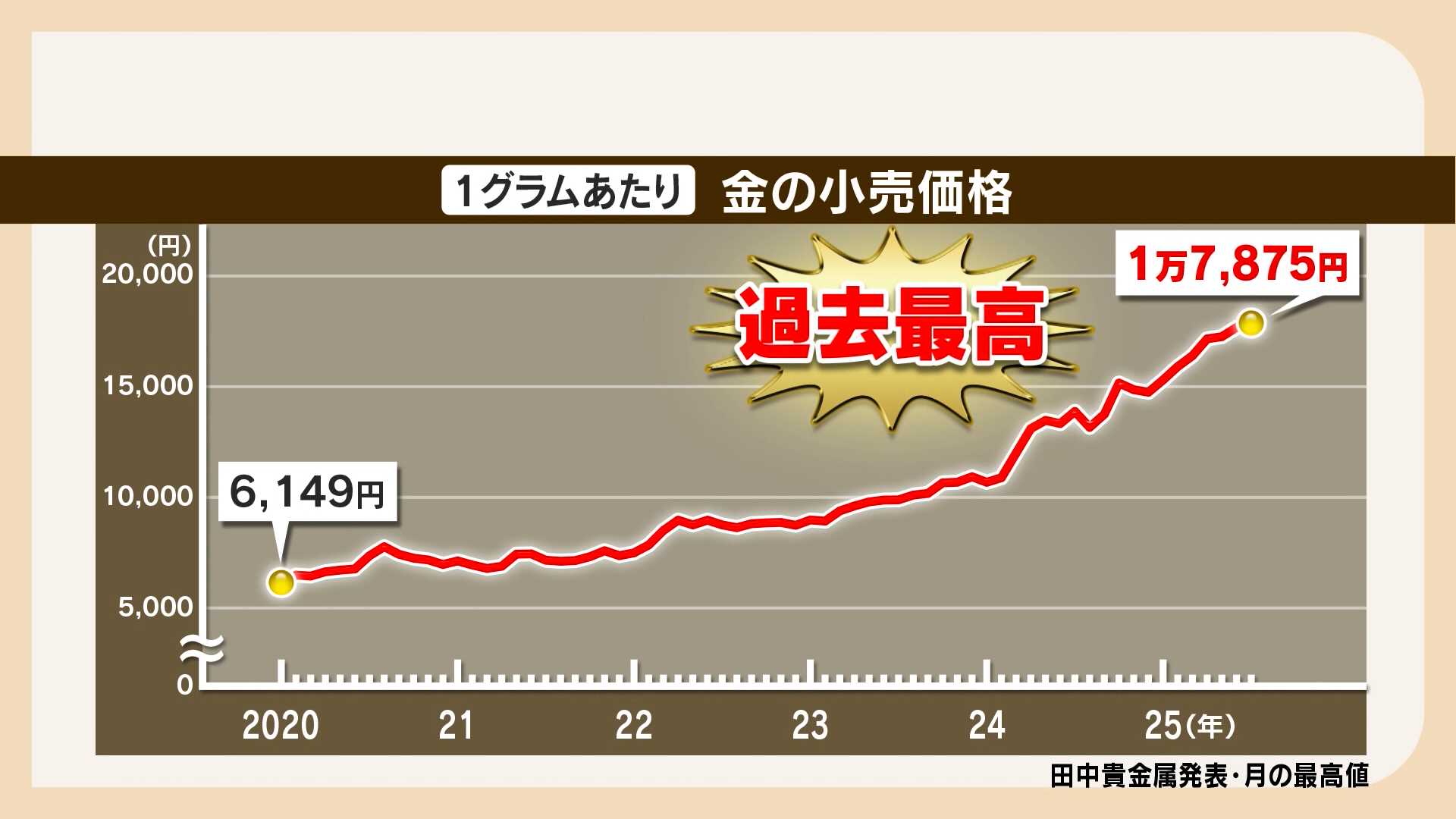 大手地金商・田中貴金属の1グラムあたりの金の小売価格は、上昇傾向が続いていて、おとといは過去最高となる1万7875円となっています。