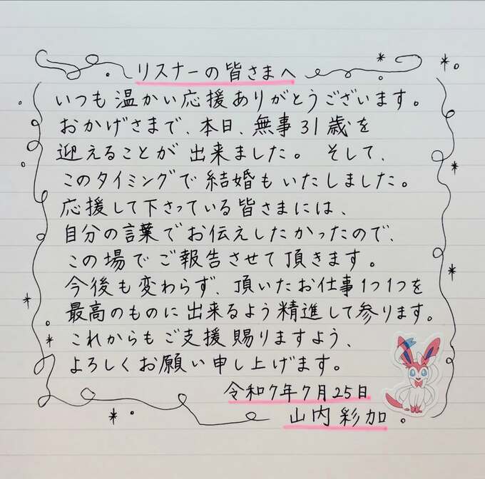 山内さんのメッセージには「リスナーの皆さまへ」と題して「本日、無事31歳を迎えることが出来ました。」と報告。さらに「このタイミングで結婚もいたしました。」と、ダブルで嬉しい報告となっています。