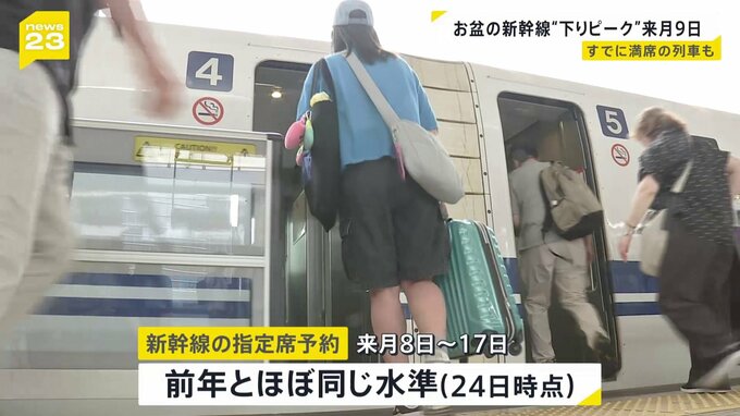 JR各社がお盆期間の新幹線の予約状況を発表しました。今年も混雑が予想されています。新幹線のお盆期間の指定席。予約の数は24日時点で前の年とほぼ同じ水準になっています。下りのピークは来月9日。午前中に東京…