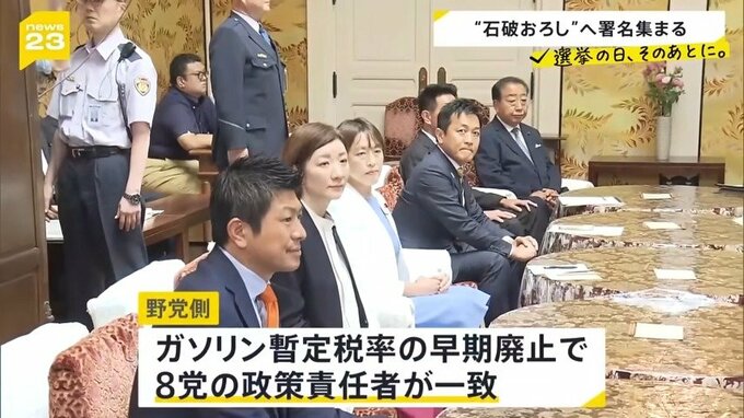 その野党側ですが、ガソリン暫定税率の早期廃止で、8党の政策責任者が一致しました。早ければ8月1日に召集される予定の臨時国会で法案を提出します。