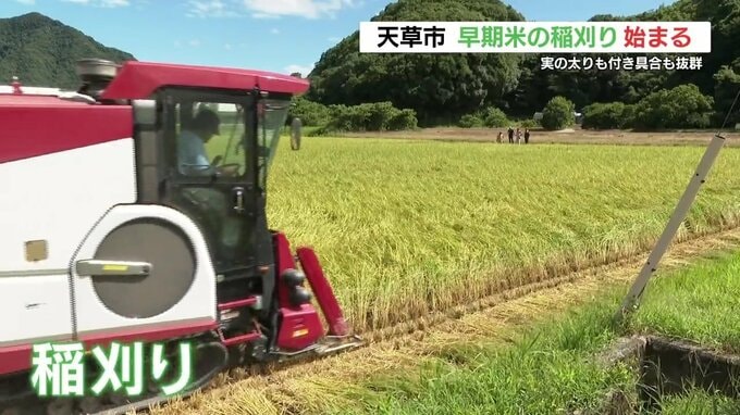 熊本県の天草地方では、早くも3月に田植えをした早期米の稲刈りが始まりました。早期米の稲刈りが始まったのは天草市河浦町の水田で、「農事組合法人 一町田下」の生産組合の人たち10人が、強い日差しが照りつける…