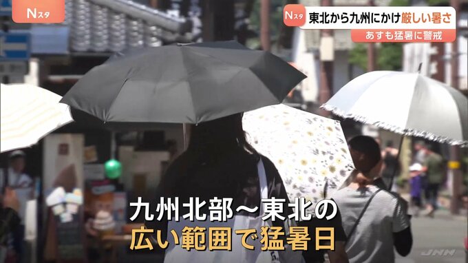 きょうは、九州から東北にかけての広い範囲で厳しい暑さとなりましたが、あすも北日本から西日本の広い範囲で猛暑日となる見込みで、熱中症に警戒が必要です。きょうは、高気圧の影響で、九州北部から東北にかけて…