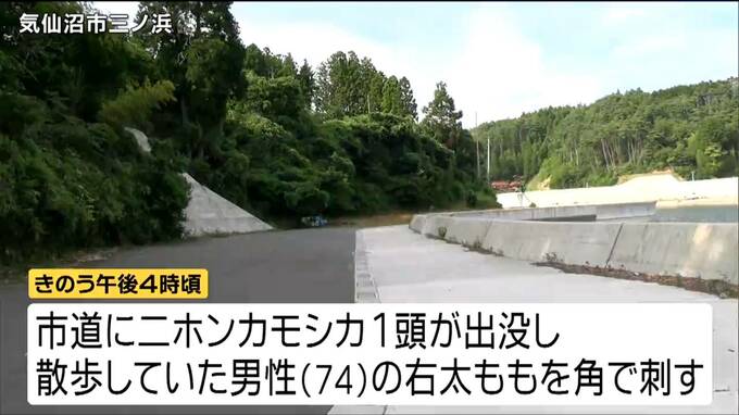警察によりますと26日午後4時頃、気仙沼市三ノ浜の市道に二ホンカモシカ1頭が出没し、付近を散歩していた74歳の男性の右太ももを角で刺しました。