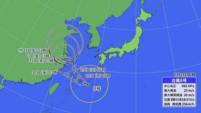 台風8号は28日6時時点で、那覇市の東北東にあり、1時間におよそ25キロの速さで西北西へ進んでいます。中心の気圧は985ヘクトパスカル、中心付近の最大風速は20メートル、最大瞬間風速は30メートルとなっています。