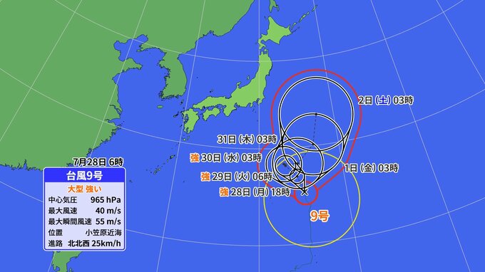 一方、大型で強い台風9号は、28日6時には小笠原近海にあって、1時間におよそ25キロの速さで北北西へ進んでいます。