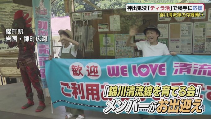 錦町駅に到着すると錦川清流線を育てる会のメンバーが横断幕を手にお出迎え。ティラノサウルスたちは足元に注意しながらホームに降り立ちます。猫男爵も先回りして駆けつけていました。突然、現れたティラ軍団に笑顔がこぼれます。