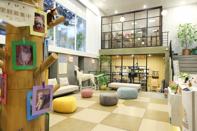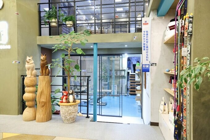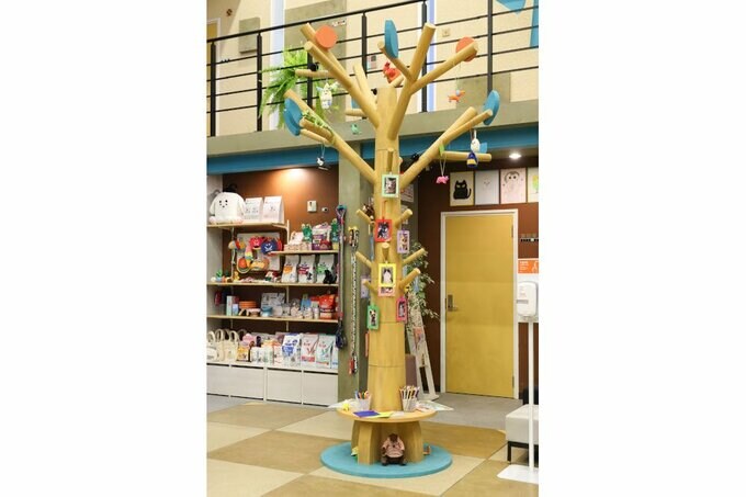 吹き抜けの待合室の中央に立つ、シンボリックな「木」。枝には、里親募集中の動物たちの写真がつるされている。羽染氏は「実際の動物病院を見学させていただいた時に掲示板に貼ってあったのを見たのですが、吹き抜けの空間を生かして、真ん中に飾ったら面白いんじゃないかと思って」と話す。