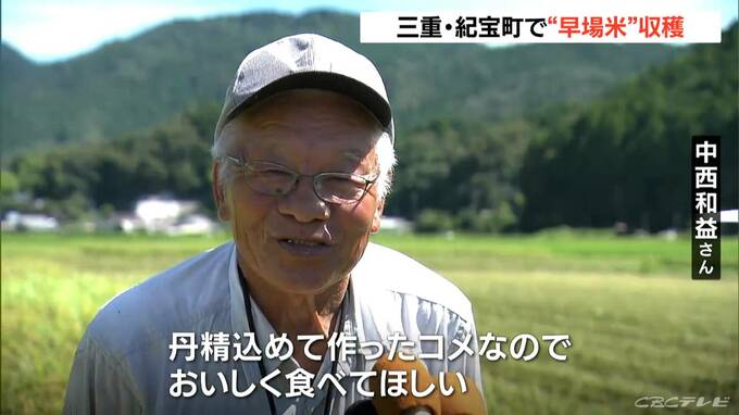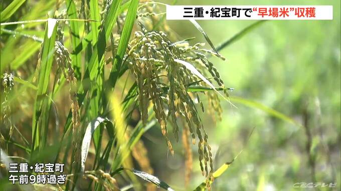 通常のコメよりも早く収穫期を迎える、早場米の稲刈りが三重県紀宝町で始まりました。