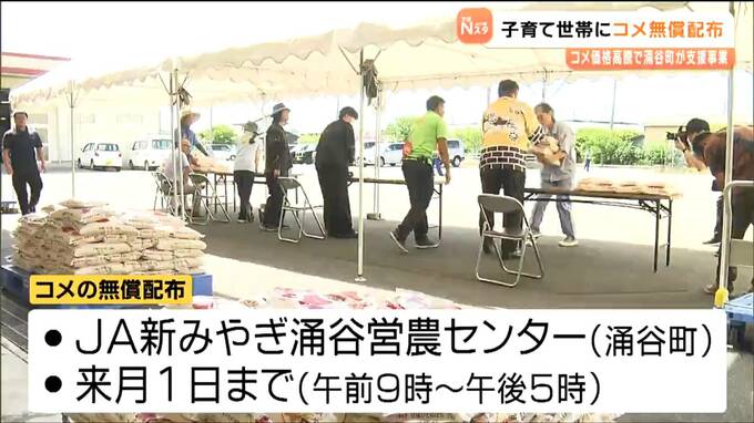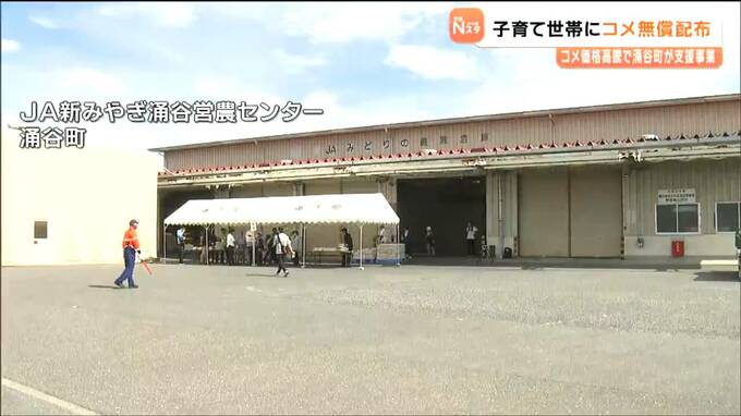 宮城県涌谷町で、28日から高校生までの子どもがいる保護者を対象にコメの無償配布が始まりました。