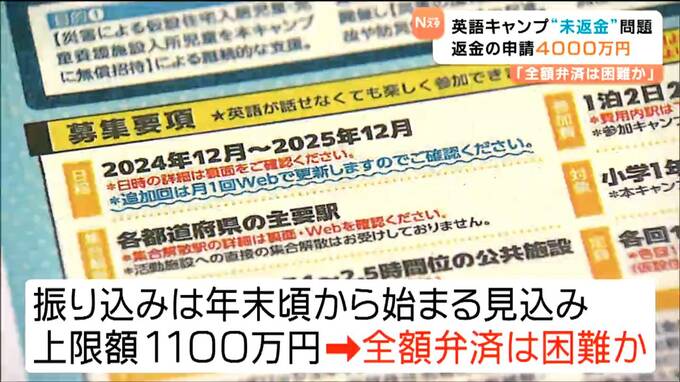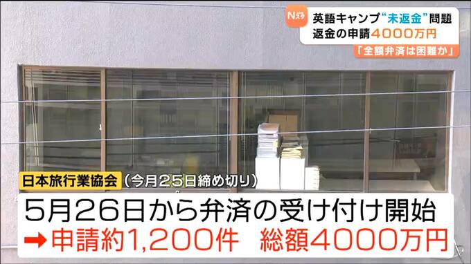 イベントが中止になったにも関わらず、保護者への未返金が相次いでいる子ども向けの英語キャンプを巡る問題で、弁済を担当する日本旅行業協会に対し、7月25日まで締め切りまでに約1200件の申請があったことが分かりました。総額は4000万円ほどに上っているということです。
