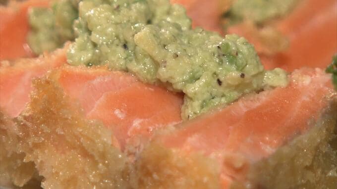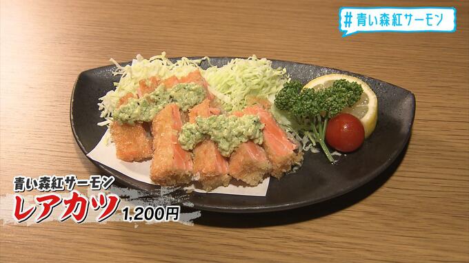 こちらでいただくのは、青い森紅サーモンを使った『レアカツ』。サーモンならではの色が鮮やかで食欲をそそります。俵谷アナが試食します。