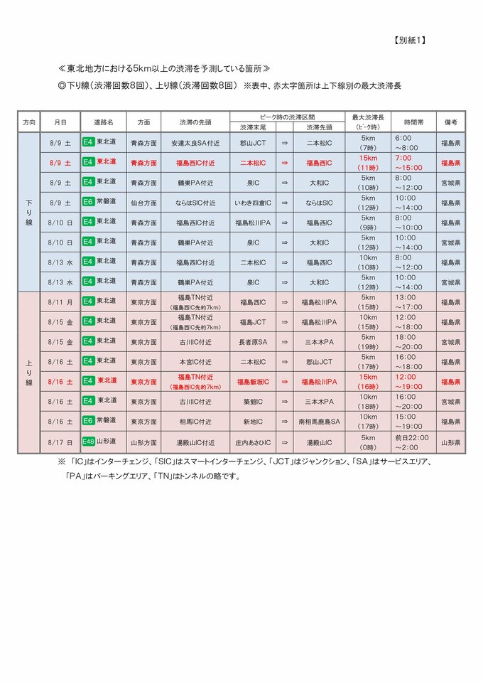 【お盆の交通情報 高速道路の渋滞予測2025】東名・東北道・常磐道・関越道…渋滞見込まれる区間・時間帯など一覧あり いつ・どこで混雑する?【NEXCO東日本・NEXCO中日本(首都圏・東日本・東北版まとめ)】 青森テレビ 2025年8月14日(木) 12:39 国内 【東北版】 東北地方における5km以上の渋滞を予測している箇所 東日本高速道路株式会社 東北支社「お盆期間の高速道路における渋滞予測について【東北版】」資料より 東日本高速道路株式会社 東北支社「お盆期間の高速道路における渋滞予測について【東北版】」資料より