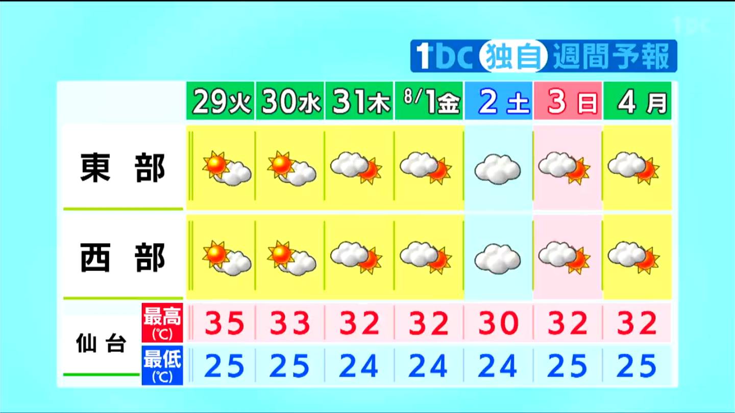 予想最高気温は、仙台市で35℃、古川でも35℃と猛暑日となる所が多くなりそうです。一方、最低気温は22℃から25℃と、28日と同じかやや低い予想です。