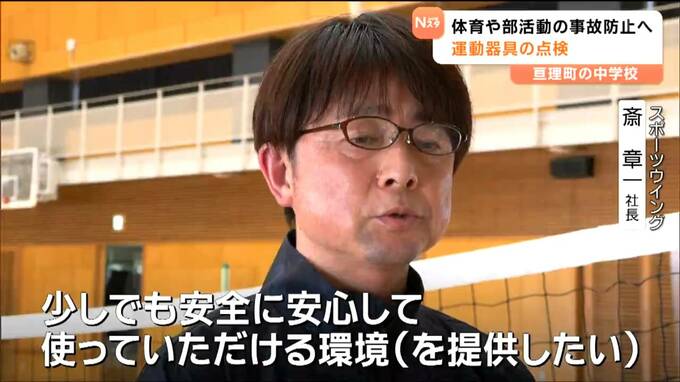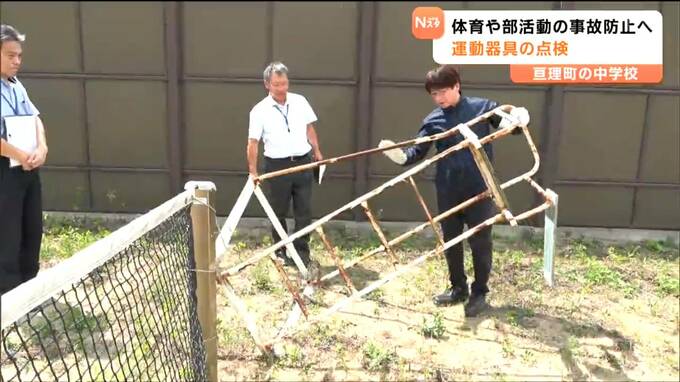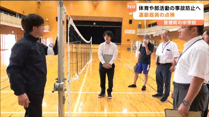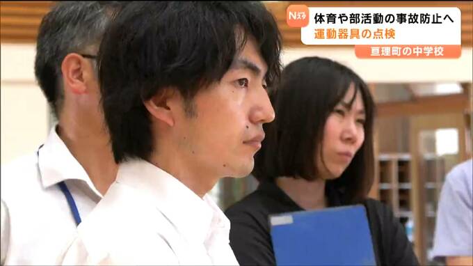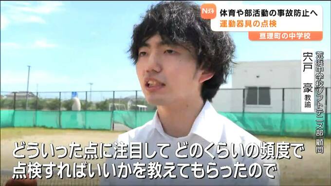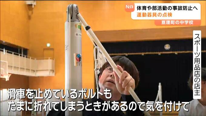 宮城県亘理町の荒浜中学校で行われた安全点検には、体育の教員や部活動の顧問など約10人が参加し、町内のスポーツ用品店の店主から体育や部活動などで使う器具を点検する際の注意点について指導を受けました。