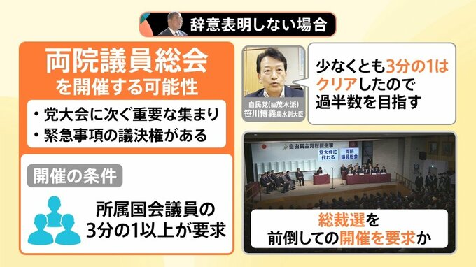 今行われているのが「両院議員懇談会」ですが、「両院議員総会」を開催する可能性があります。これは党大会に次ぐ重要な集まりという位置づけで、緊急事項の議決権があります。所属する国会議員の3分の1以上が開催を要求した場合、開催されるということです。