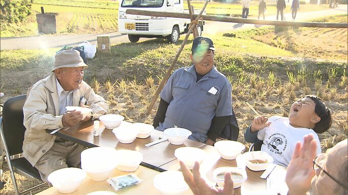 米作りを手伝ってくれた近所の人々がみんな笑顔でご飯を頬張る姿に、ゆうちゃんも満足気でした。