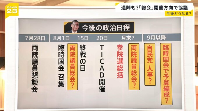 両院議員総会の開催に向けて、協議は8月の上旬。遅くとも参議院の総括に合わせてその前後にはやる。それを受けて、森山幹事長が辞表を出しそうですが、それを石破さんが受け取るのか、慰留するのか。