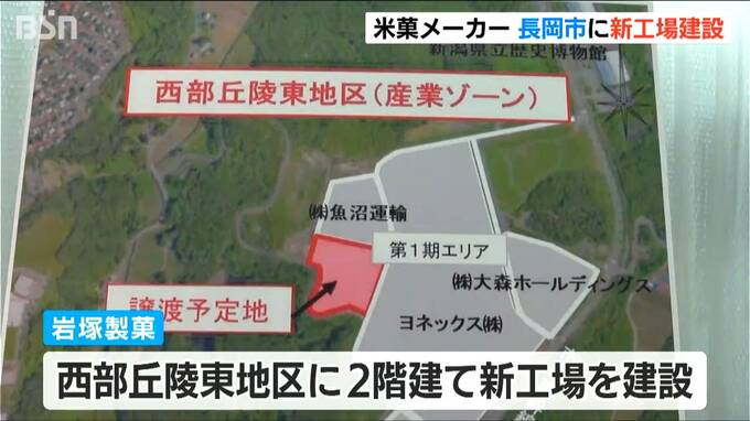 長岡市の米菓メーカー『岩塚製菓』が進出するのは、市が企業誘致を進める長岡インター近くの産業ゾーン「西部丘陵東地区」で、新たに2階建ての米菓製造工場を建設します。