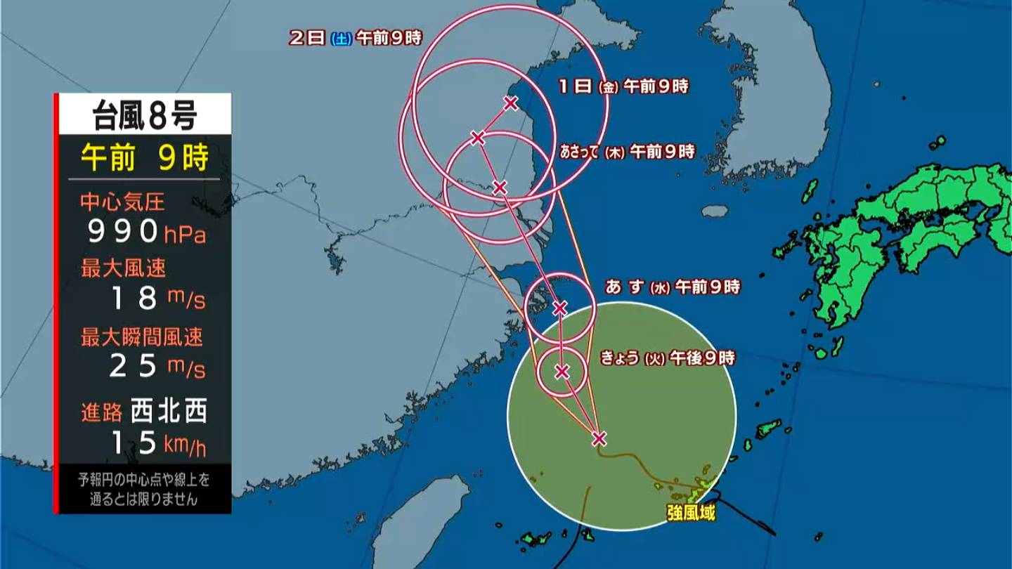 台風8号は、奄美大島の西南西およそ600キロの海上を時速15キロで西北西に進んでいます。中心気圧は990ヘクトパスカル、中心付近の最大風速は18メートル、最大瞬間風速は25メートルです。