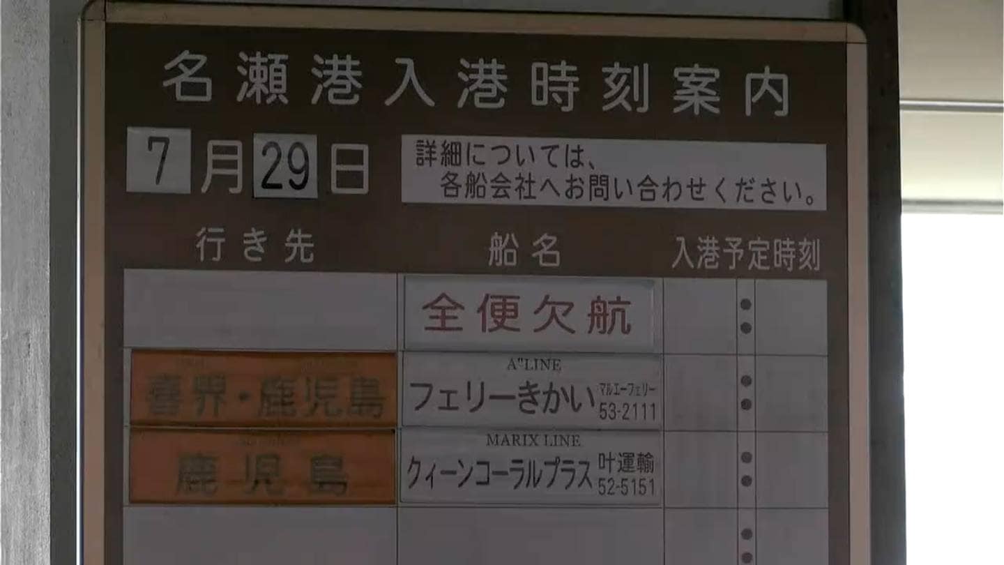 29日、欠航が決まっているのは、奄美・沖縄航路のフェリーあまみの下り便、フェリーきかいの上り便、種子島・屋久島航路のフェリー太陽IIの午前出発する便です。