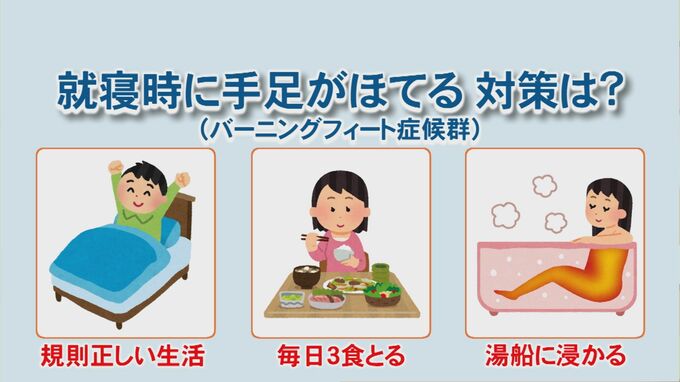 「生活が乱れていたり、睡眠が十分じゃないと自律神経が乱れやすいので、規則正しい生活をすることが大事で、食事もきちんと3食をとる、お風呂でも湯船にちゃんと使って体温調節機能を正常化する。そうすることで、バーニングフィートも予防できるかと思います」