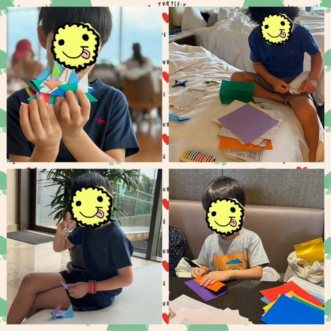 投稿された写真には、子どもたちが折り紙を使って楽しそうに手裏剣を作る様子が捉えられています。上段の写真では、完成した折り紙作品を誇らしげに持つ子どもの姿や、白いベッドの上に色とりどりの折り紙を広げている場面が写されています。