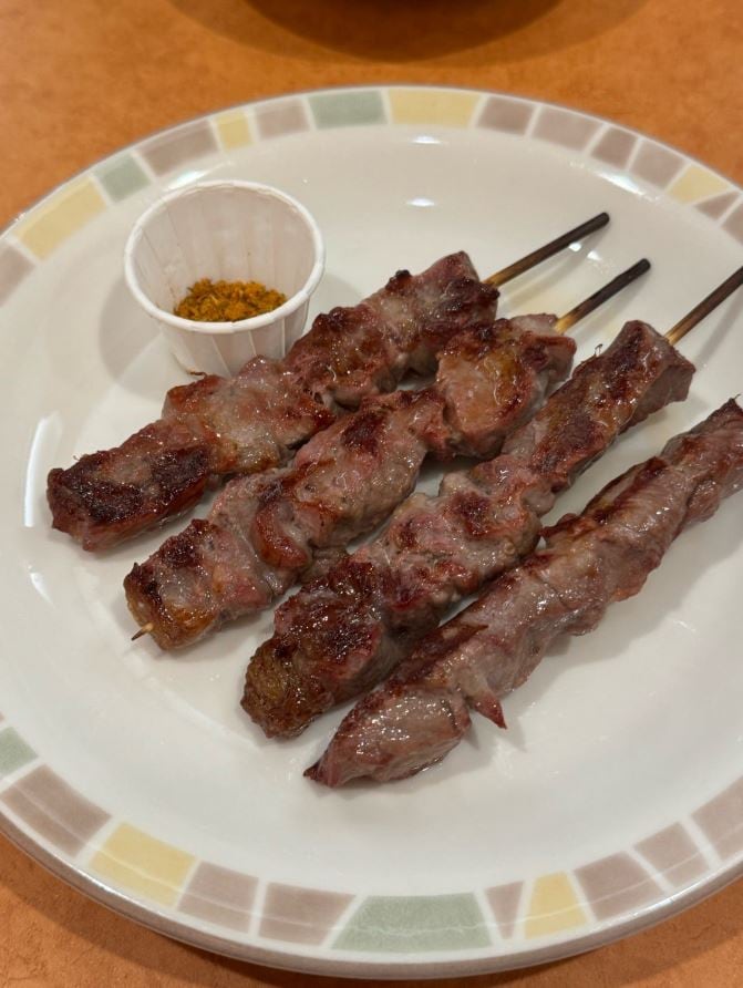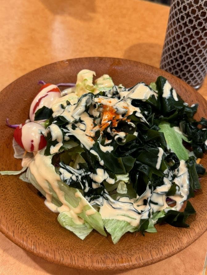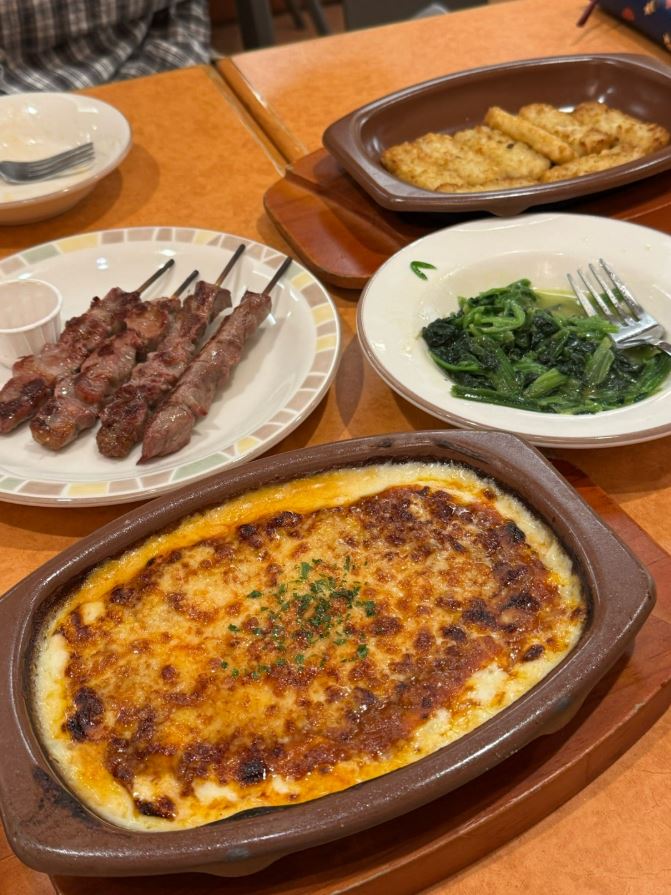 注文したメニューは、わかめサラダ、ラムの串焼き、パスタなど。写真からは、木製のボウルに盛られた新鮮な野菜サラダや、こんがりと焼き色の付いたドリア、ジューシーな串焼きの数々が確認できます。