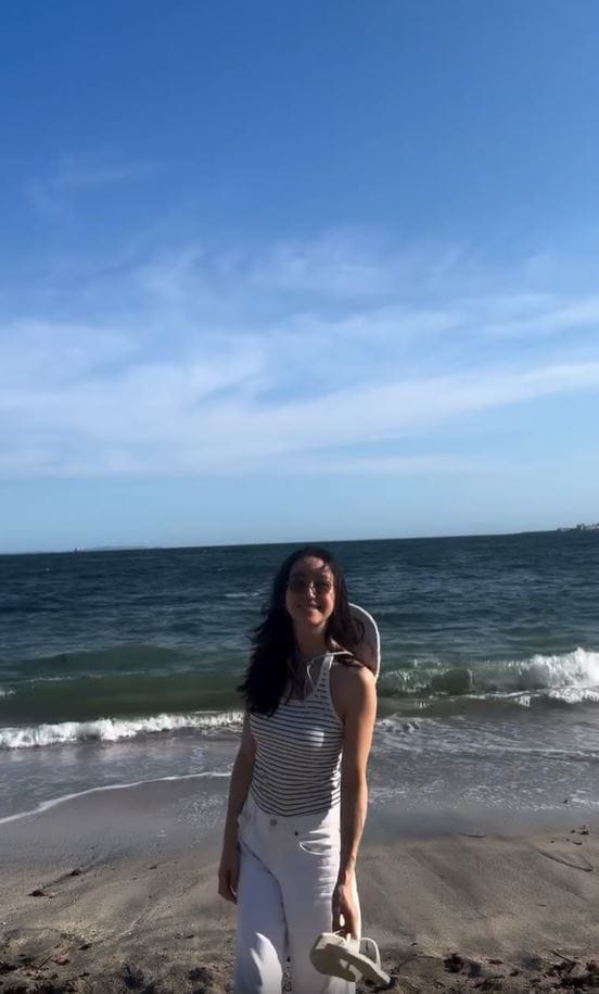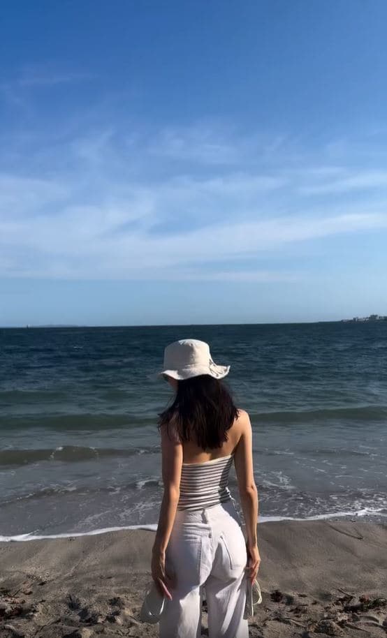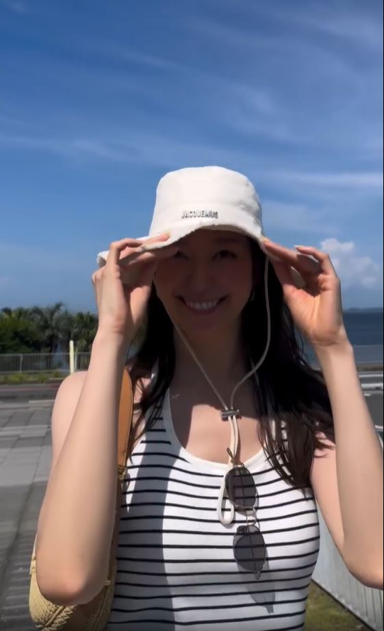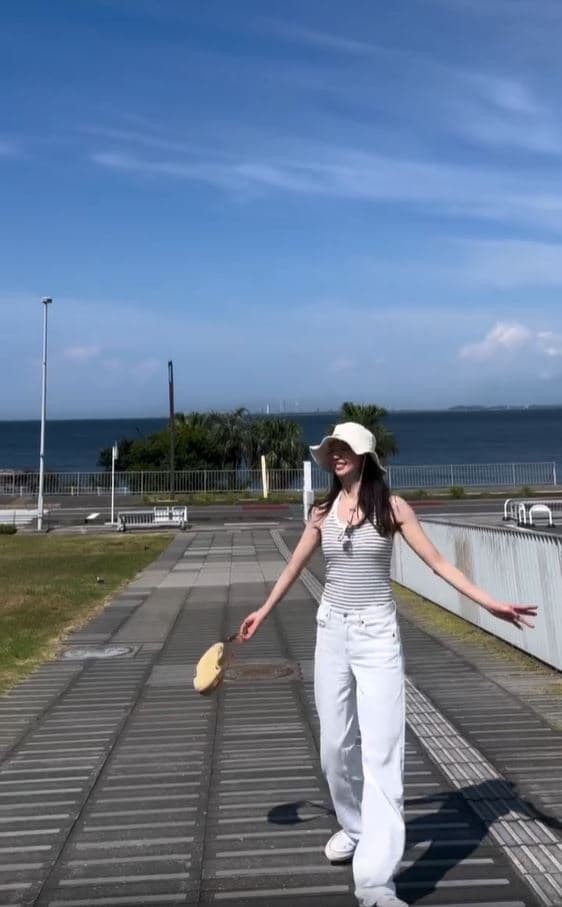 続けて、「海とかき氷を求めて思いつきでドライブ」と明かし、白いバケットハットにボーダー柄のタンクトップ、白いパンツという爽やかな装いで、海辺を散策する様子を動画に収めています。