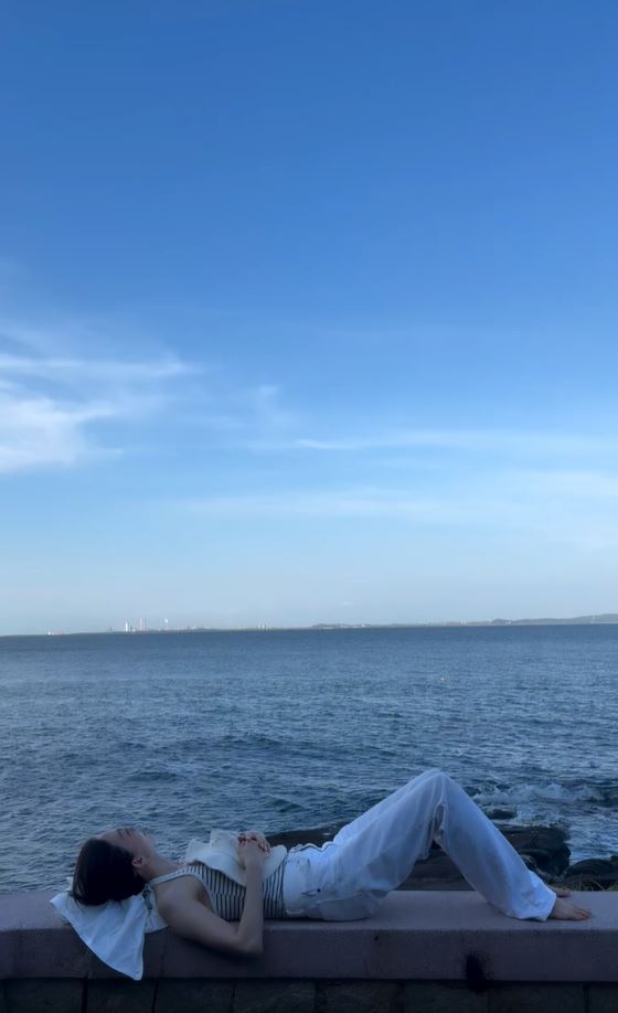 海辺では、壁の上に横たわり、目を閉じてリラックスする一幕も。青い空と海を背景に、心身ともにリフレッシュする時間を過ごしている様子が印象的です。