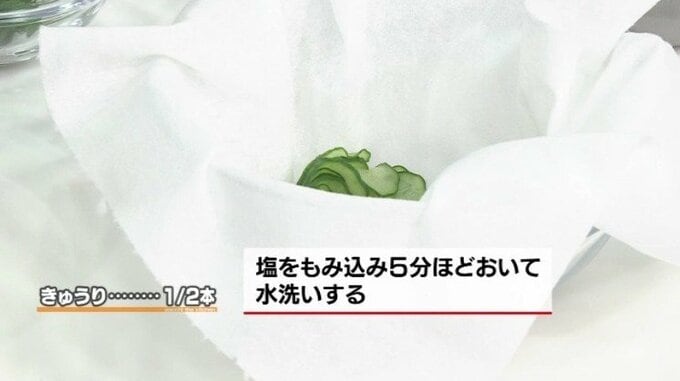 2.きゅうりを小口切りにして塩でもむ。しんなりしたら塩を洗い流してキッチンペーパーで水気をしぼる。青じそを千切りにする。