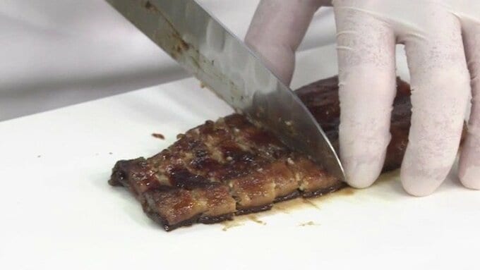 1.うなぎのかば焼きを温めて1センチ幅に切る。