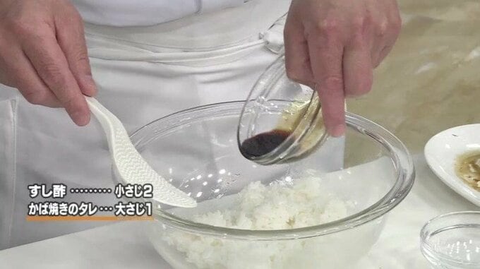 4.ご飯にすし酢とかば焼きのタレを混ぜる。