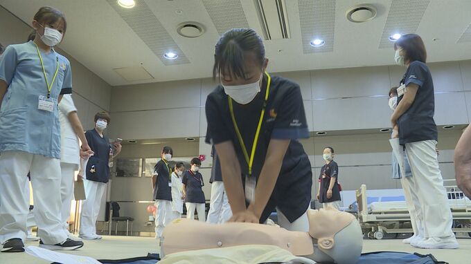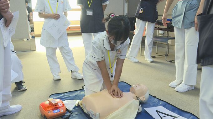 下関市内の小学5年生から中学2年生までの10人が参加しました。看護師の指導を受けながら、車いすやストレッチャーでの移動や介助のほか、心臓マッサージの仕方やAEDの使い方も体験しました。