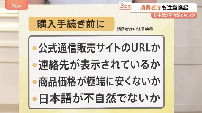 ニセ広告が横行する中で、消費者庁も注意喚起をしています。▼公式通信販売サイトのURLか、▼連絡先が表示されているか、▼商品価格が極端に安くないか、▼日本語が不自然でないか。購入手続き前にしっかり確認するようにしてください。