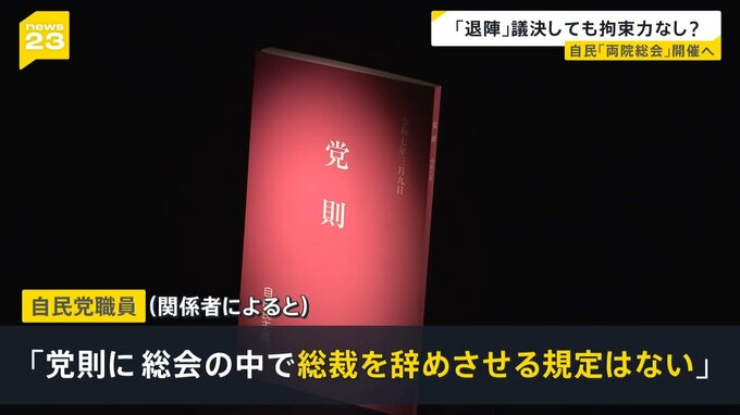 すなわち、総会での決定は拘束力がなく、退陣させることも、総裁選の前倒しも“事実上できない”というのです。