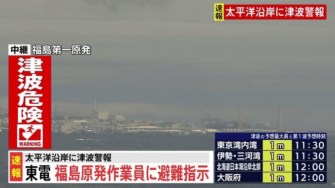 東京電力は午前8時51分に、福島第一原発の敷地内で働く作業員に対して避難指示を出しています。東京電力は「津波情報を注視するとともに、発電所への影響の有無を監視しています」としています。