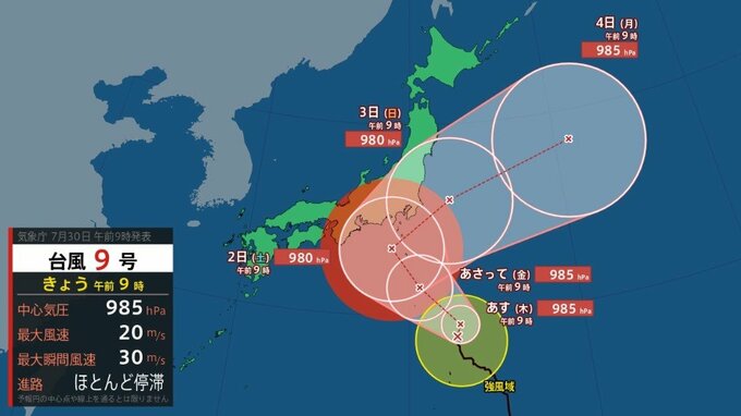 30日午前9時には、父島の北およそ210キロにあって、ほとんど停滞しています。中心の気圧は985ヘクトパスカル、中心付近の最大風速は20メートル、最大瞬間風速は30メートルとなっています。