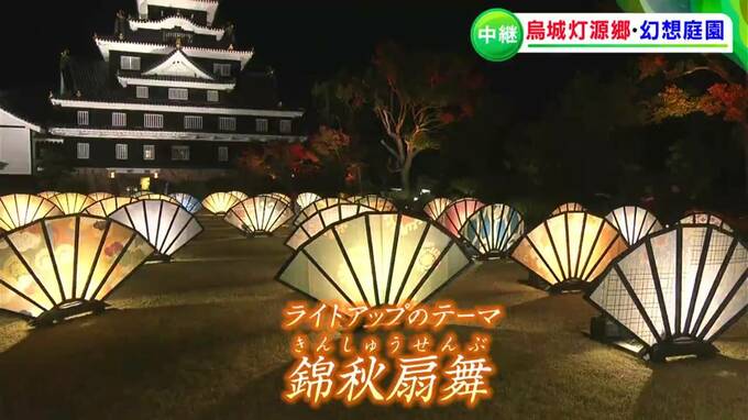 ライトアップのテーマは「錦秋扇舞(きんしゅうせんぶ)」。こちらに並ぶ50個の扇形のオブジェは、岡山藩主・池田家伝来の能装束の図案が用いられています。