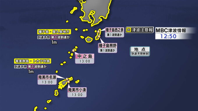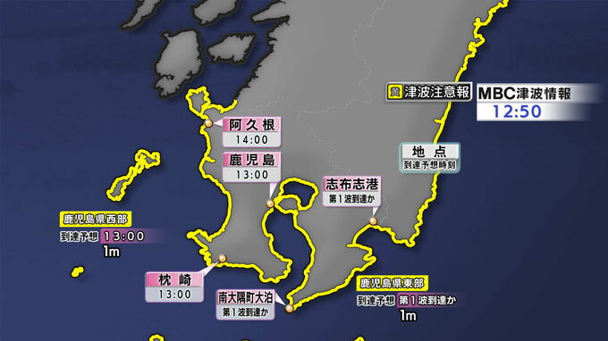 第十管区海上保安本部は、鹿児島海上保安部に現地対策室を設置しました。現在、巡視船艇などが大隅半島の太平洋側で、被害の調査や付近を航行する漁船などに無線などを使って津波注意報の発表を知らせています。