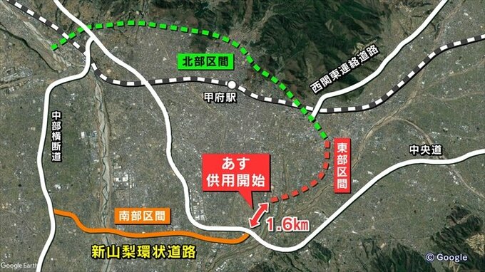 あす開通するのは「東部区間」の一部、甲府市西下条町から落合町までのおよそ1.6kmです。