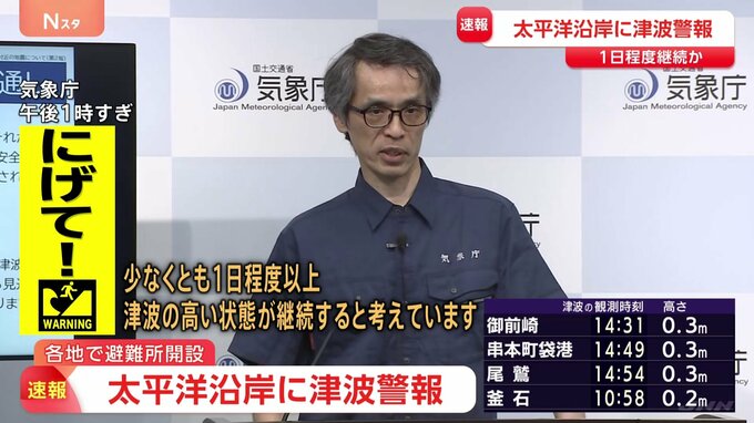 気象庁は午後1時から2回目の会見を行い、「津波が高い状態は少なくとも1日以上は続く見込み」だと発表しました。「一つの波が非常に長い。1時間くらい、一つの周期の波が時間がかかるので、非常に長い間、津波が観…