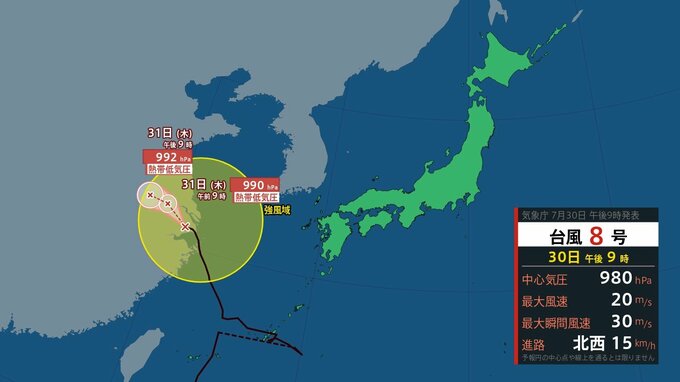 予報円の中心…北緯31度55分(31.9度) 東経119度30分(119.5度)