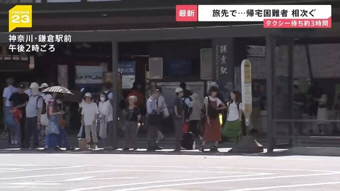 鉄道がストップした鎌倉駅。タクシー乗り場には、長蛇の列ができていました。炎天下、時刻表の前で汗をぬぐう女性や、券売機の前でぐったりする人たちの姿も。